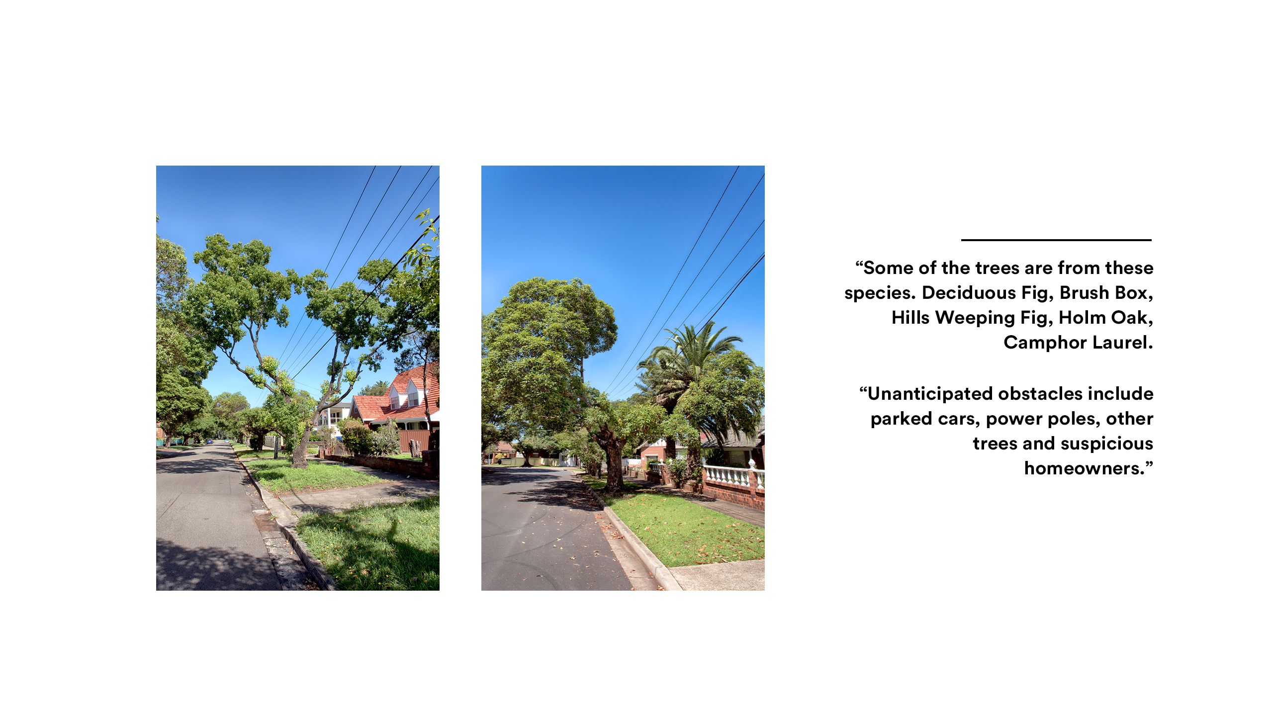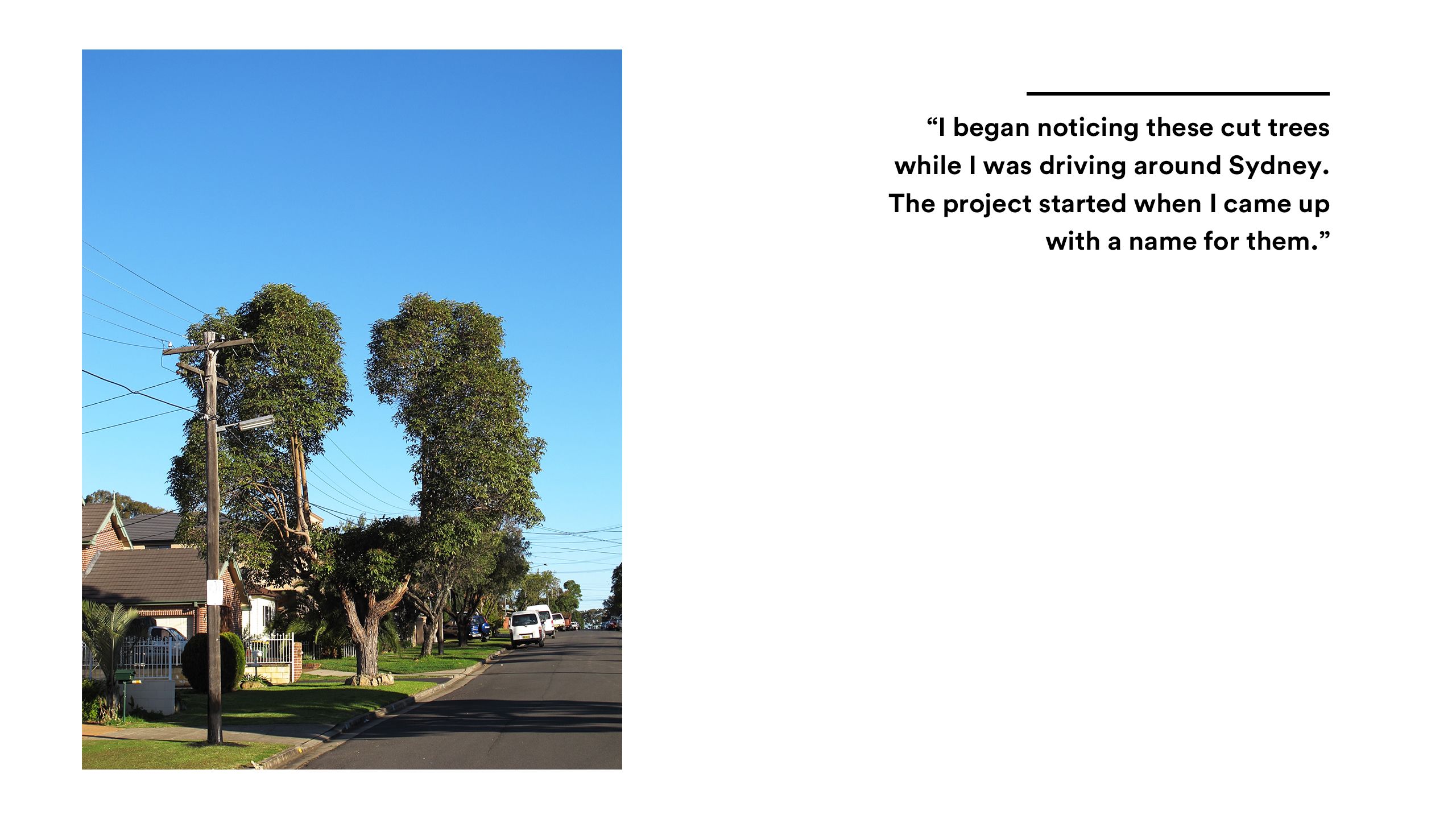 “I began noticing these cut trees while I was driving around Sydney. The project started when I came up with a name for them.”
