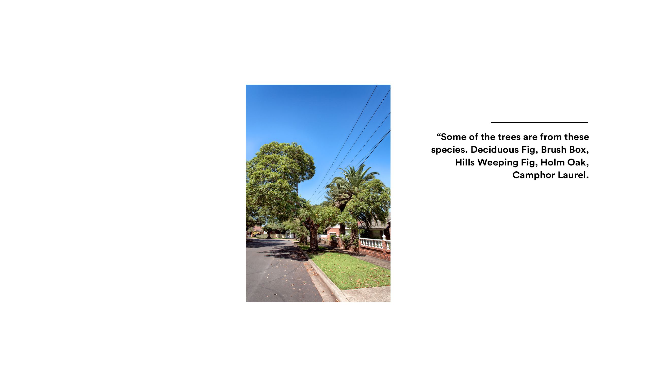 “Some of the trees are from these species: Deciduous Fig, Brush Box, Hills Weeping Fig, Holm Oak, Camphor Laurel.”