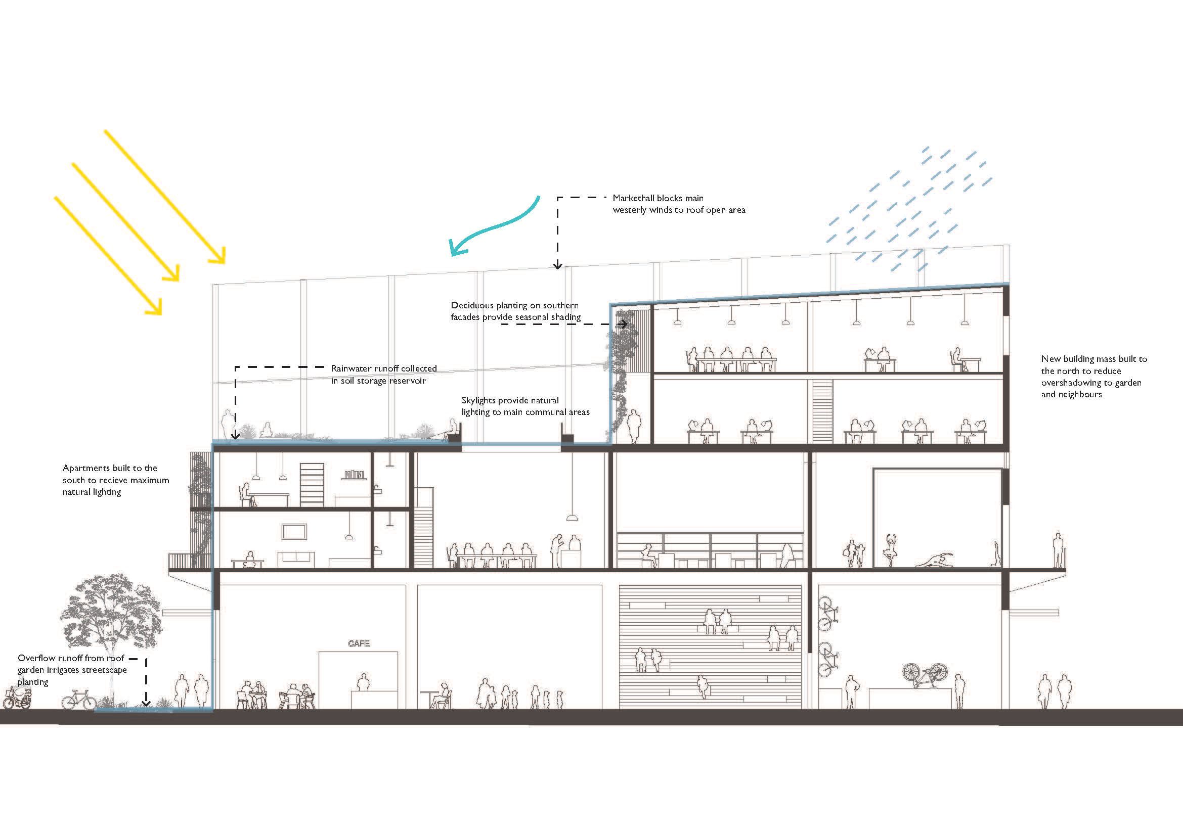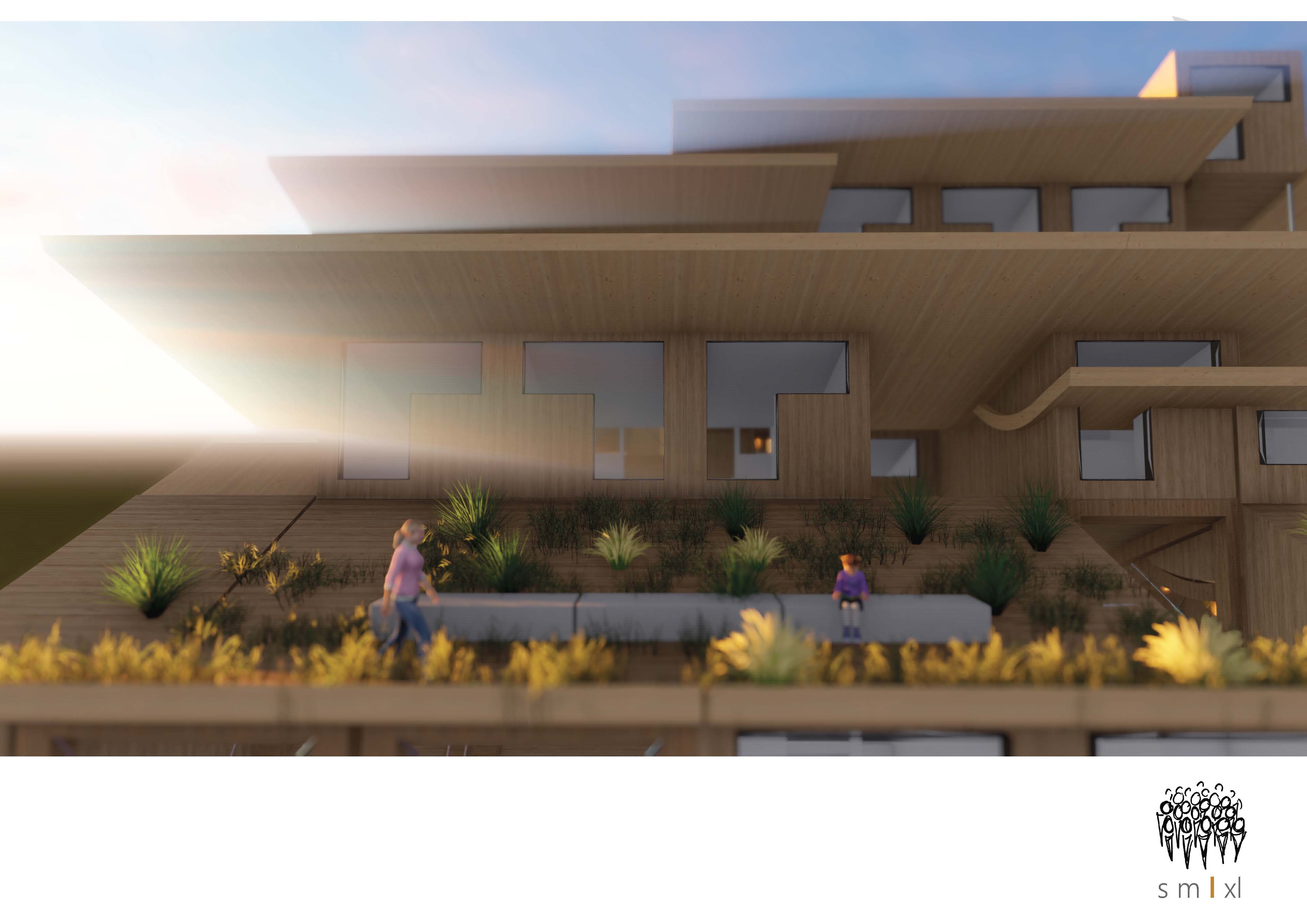 We created a mixed-use retail residential space that would become the heart of the Sundmolen community. Across the three building levels we inserted spaces for a Community Centre and City Hall, based on their aspect and connection with the city skyline. On the rooftop we proposed a natural water filtration system that service vibrant new native garden areas.