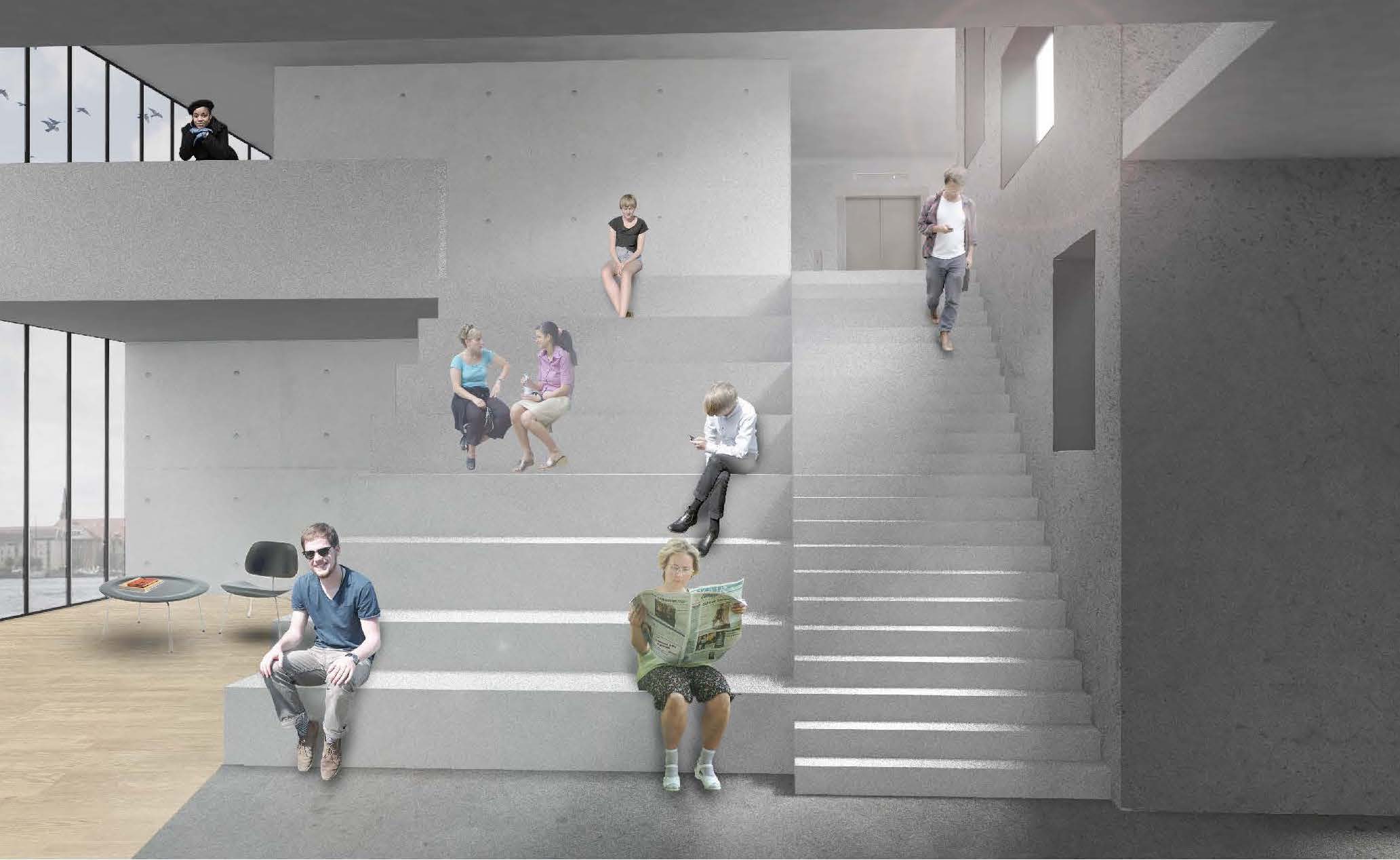 Underground was conceived as a sensory journey into nature, where a forest of columns offers up different views and connections to sea, land and sky. A low, cave-like space, flooded during high tide and inaccessible – a reminder of nature’s cycles and also of climate-change induced sea-level rises. Steps to the Water was about direct connection to the harbour at the northern broadwalk and the Underground. Its shape resembles a performance platform, echoing what is happening inside the building. Centre for Community opened the façade, turning office space over to the public for performances, exhibitions, workshops, sheltered seating area, or remote office area.