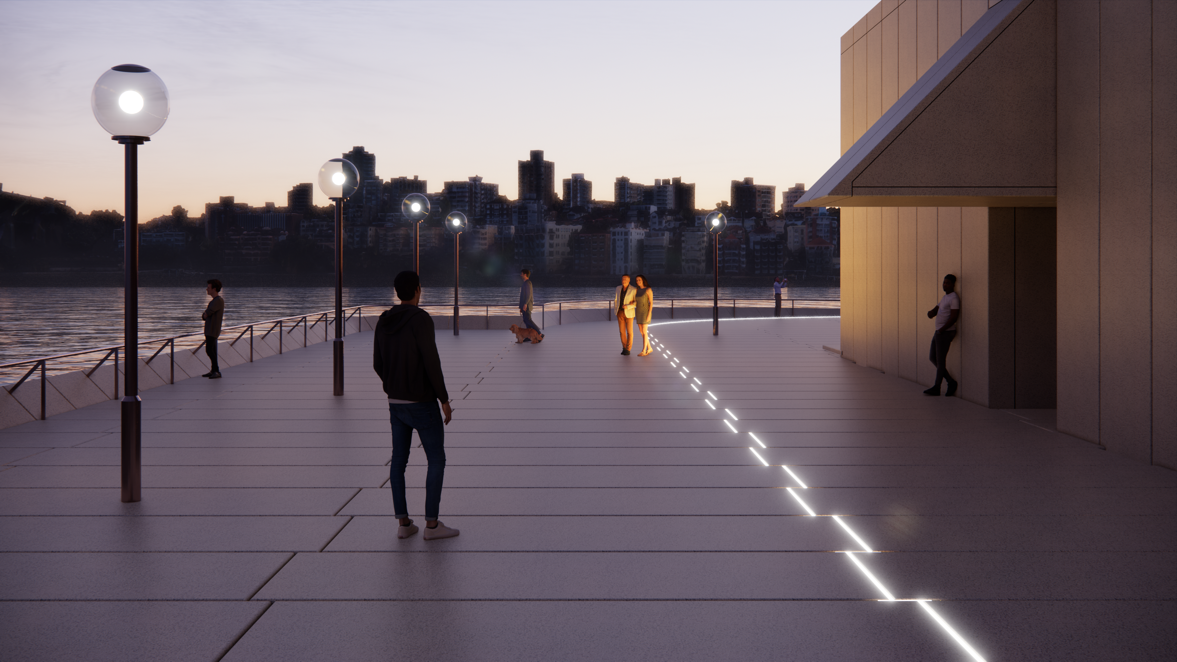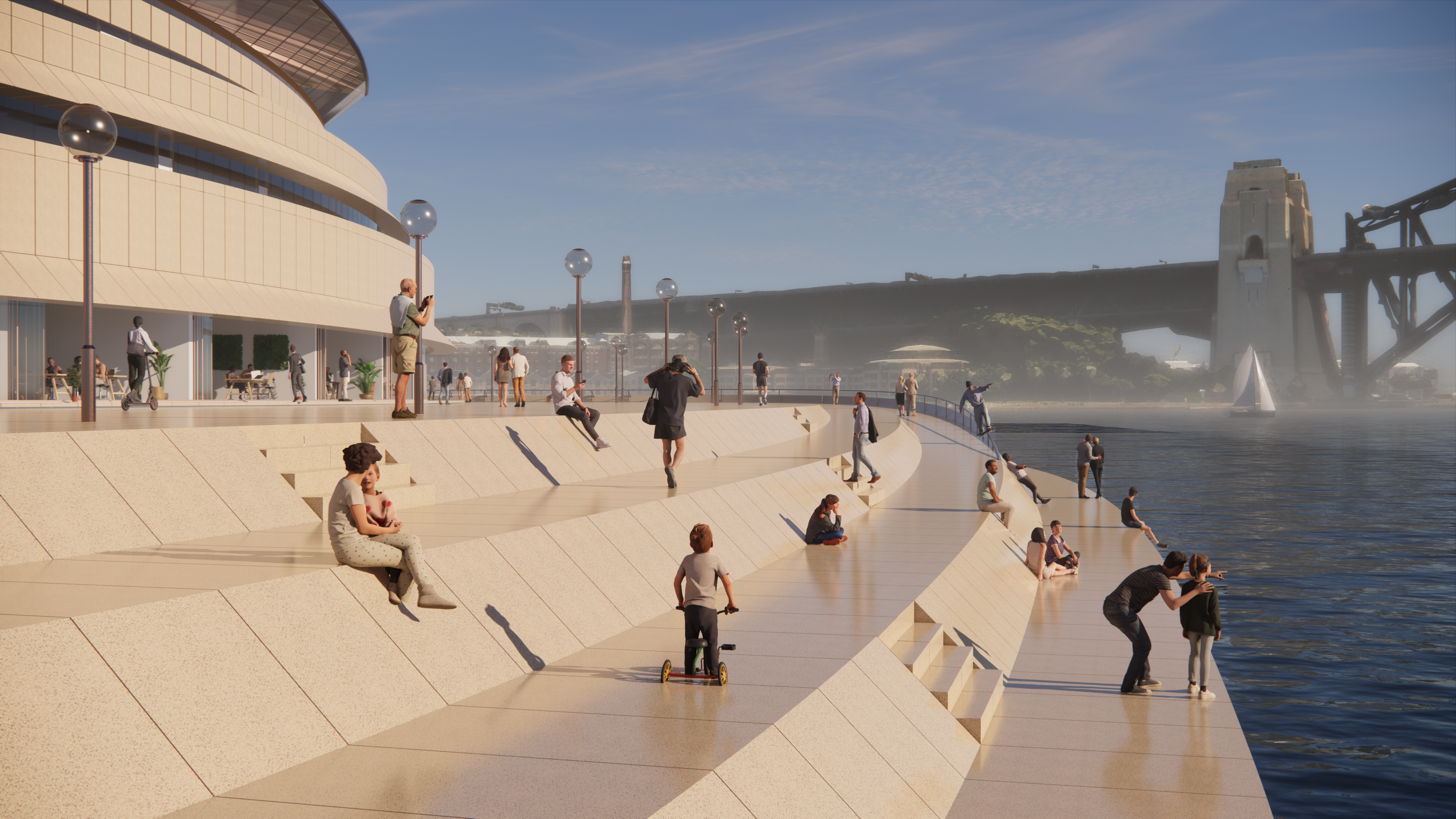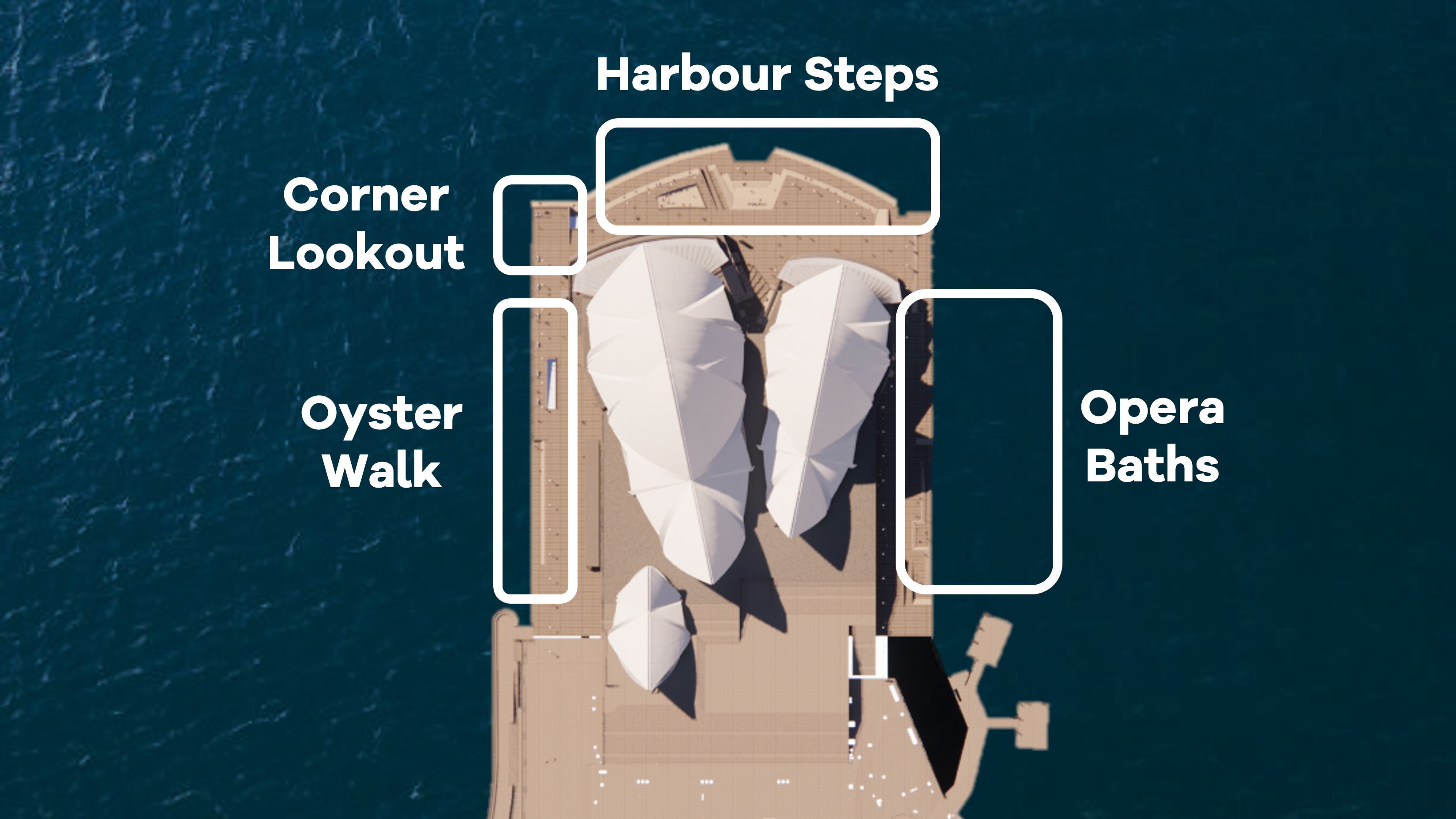 Our proposal was to make the Northern Broadwalk a distinctive public space, democratic and accessible to all – a destination in its own right, connected to a larger story by adding a series of new experiences, building on the site history and First Nations relationship with the harbour. The new touchpoint, from north to south included the Oyster Walk, Corner Lookout, Harbour Steps and Opera Baths. The Oyster Walk celebrates a staple of the Gadigal people – Sydney rock oysters, and the vast shell middens they deposited at Bennelong Point over millennia. The Corner Lookout proposed a cordoned space under the broadwalk, with tightly framed views out towards the city and Harbour Bridge. Harbour Steps proposed a shallow amphitheatre sunken into the terrace, while the Opera Baths proposed an extension to the terrace stepping down to a public bathing enclosure.