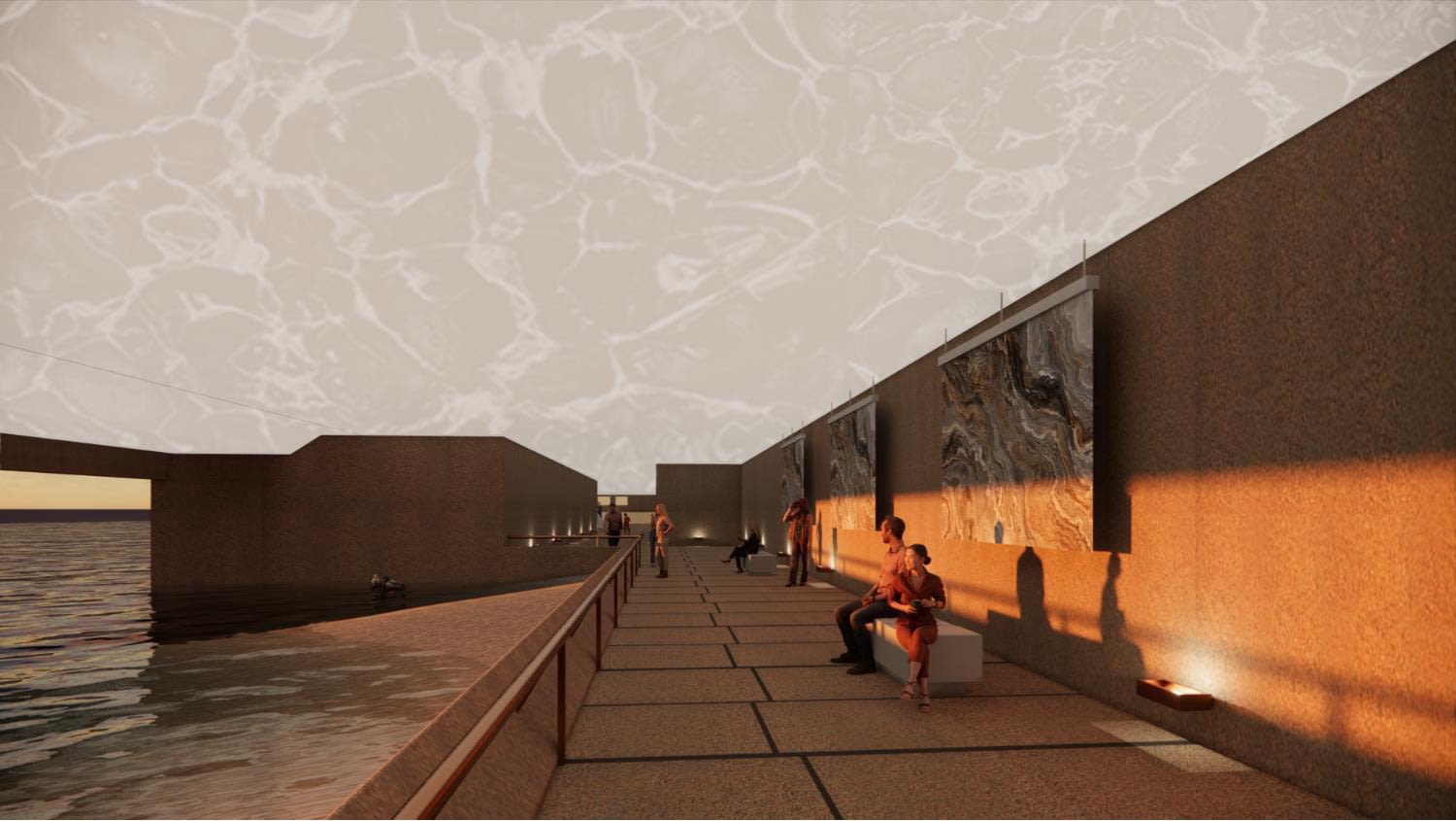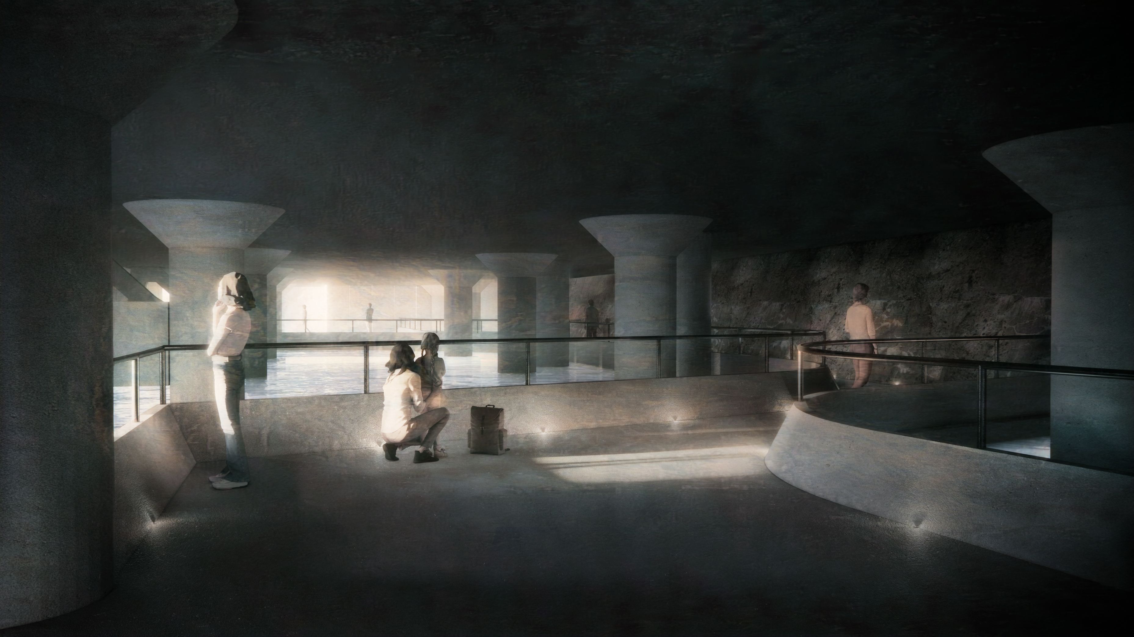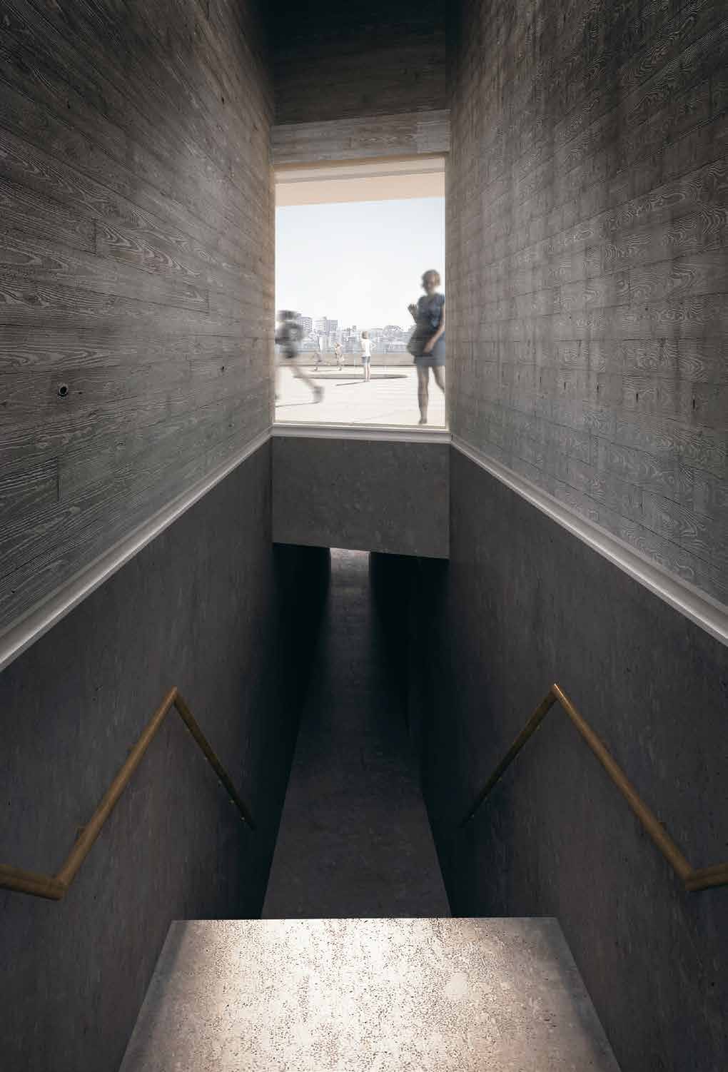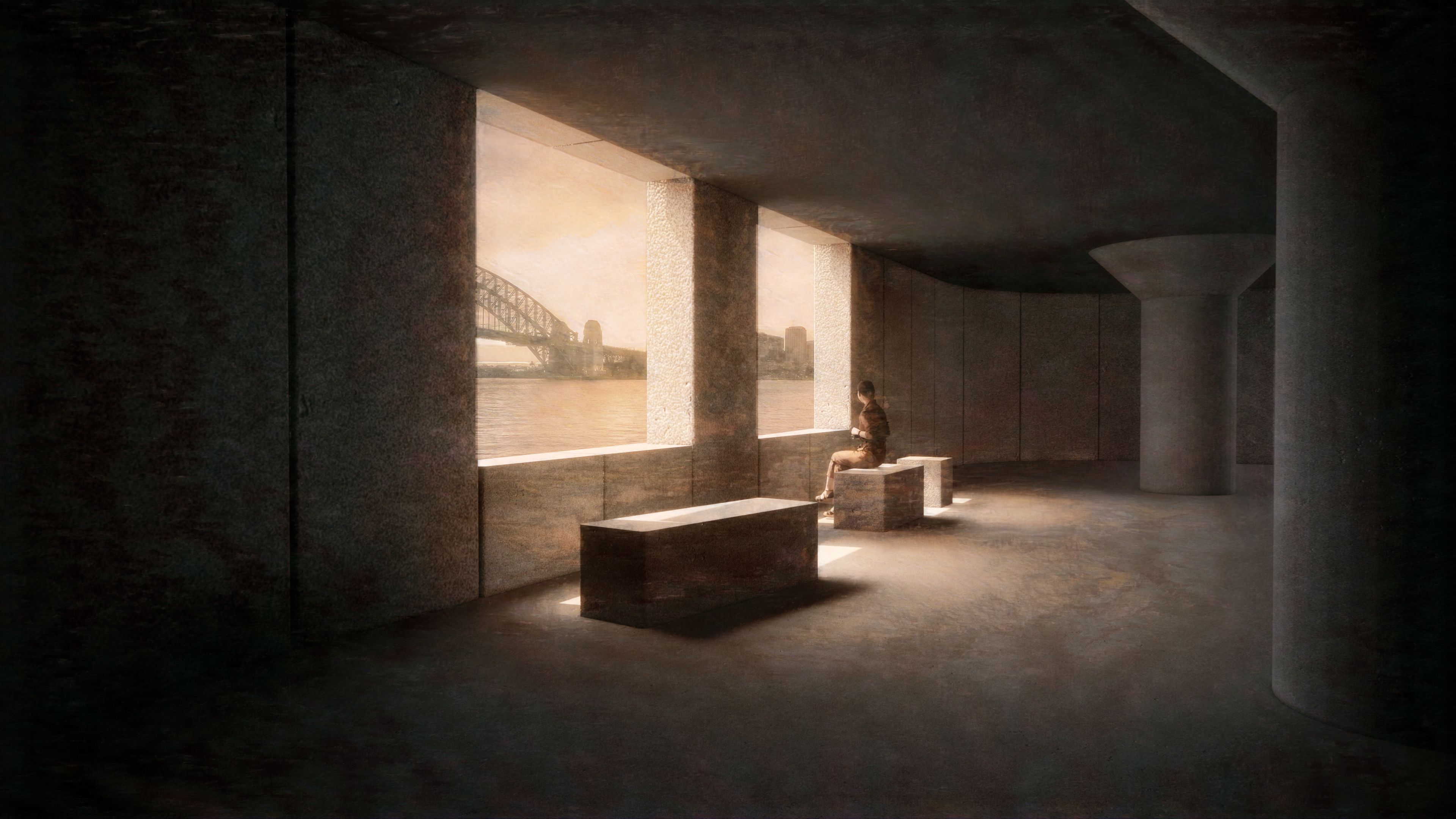 Our final proposal had two parts: an overarching urban strategy for tying together the waterfront from the Harbour Bridge through Circular Quay, the Opera House Broadwalk and the Royal Botanic Garden – making a cohesive, unbroken public space. More specifically, we designed an access point to the water, a subterranean art space and a learning centre. These attraction points along this harbour front route aimed to interpret and present history, nature, sustainability and upcoming First Nations artists. Our design utilises the natural assets of sun and sea water to technically achieve the desired luminosity and thermal atmosphere of the indoor spaces.