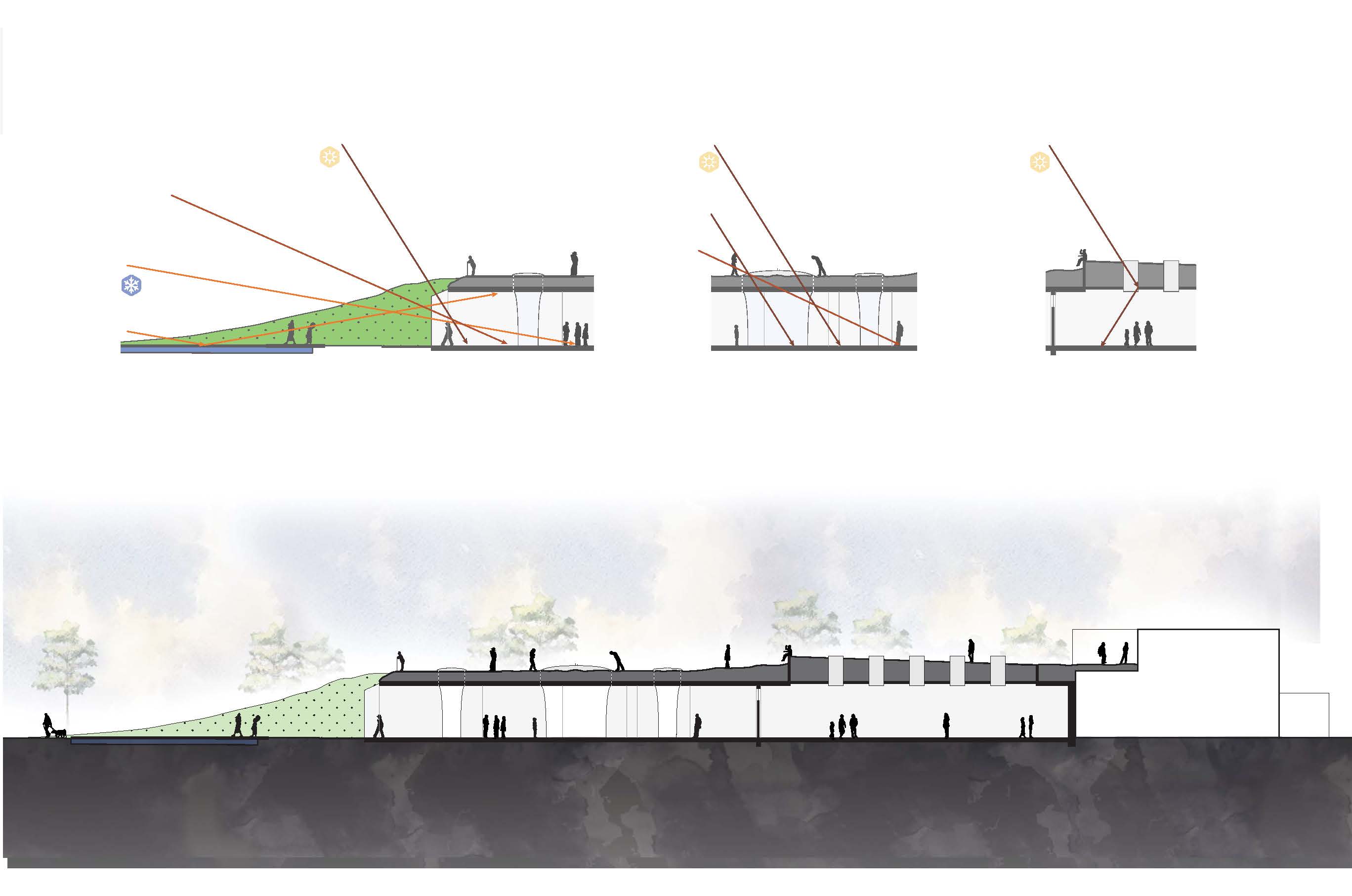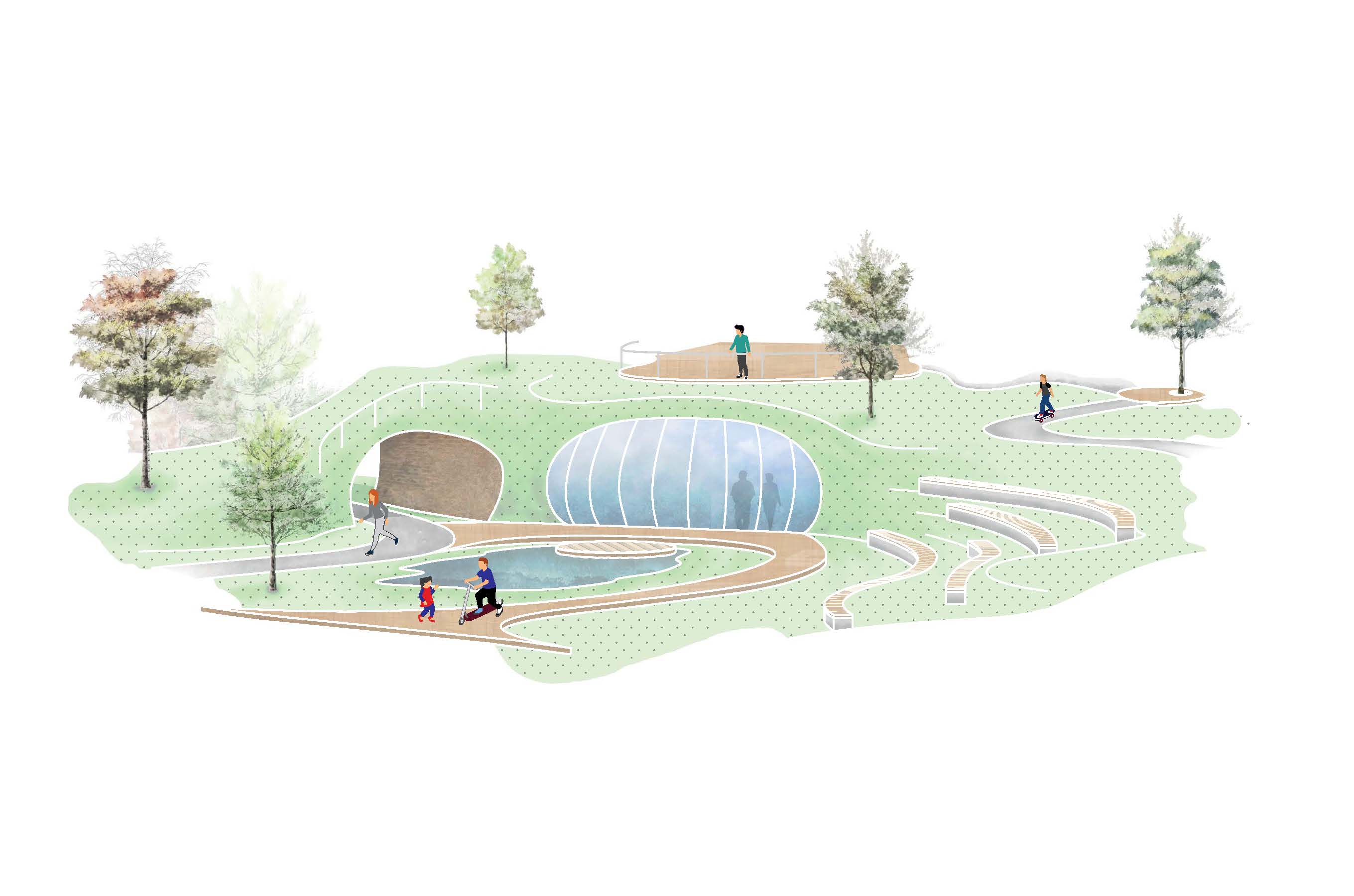 The Hill: after rigorous testing against a set of social and environmental parameters, our proposal took the form of a large hill built up against the existing LIDL supermarket, with both indoor and outdoor spaces for public performance, climbing and local markets. The park’s greenspace and the arrangement of functional areas was designed to reconnect previously unused site areas, with new bicycle and wheelchair paths to improve accessibility and circulation. Sustainability and carbon neutrality were addressed with a layered heating strategy and rainwater management systems, utilising a sizeable existing skate park.