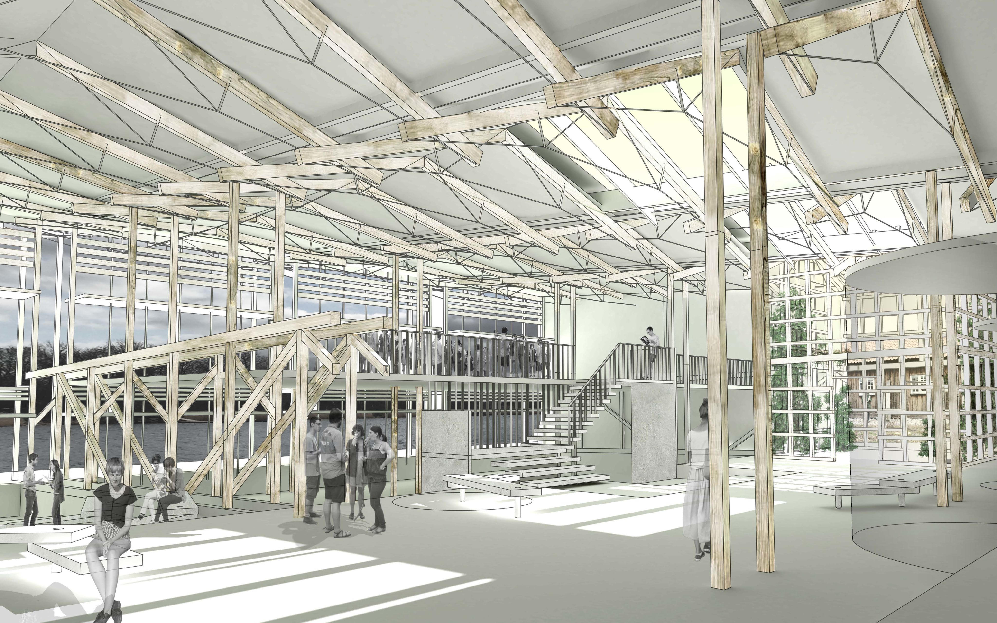 At the heart of our proposal was the roof: the existing boathouse was essentially constructed from a repeating timber portal frame. We used parametric modelling to deconstruct and reconstruct the timber frame into its constituent parts so the roof form transitioned from pitched at one end of the building, to flat at the other. The resulting new roof shape allowed a second story to be incorporated into the building, thereby expanding through alternation, not addition. This approach respected the heritage value while sustainably adapting the site for the new program and future use.