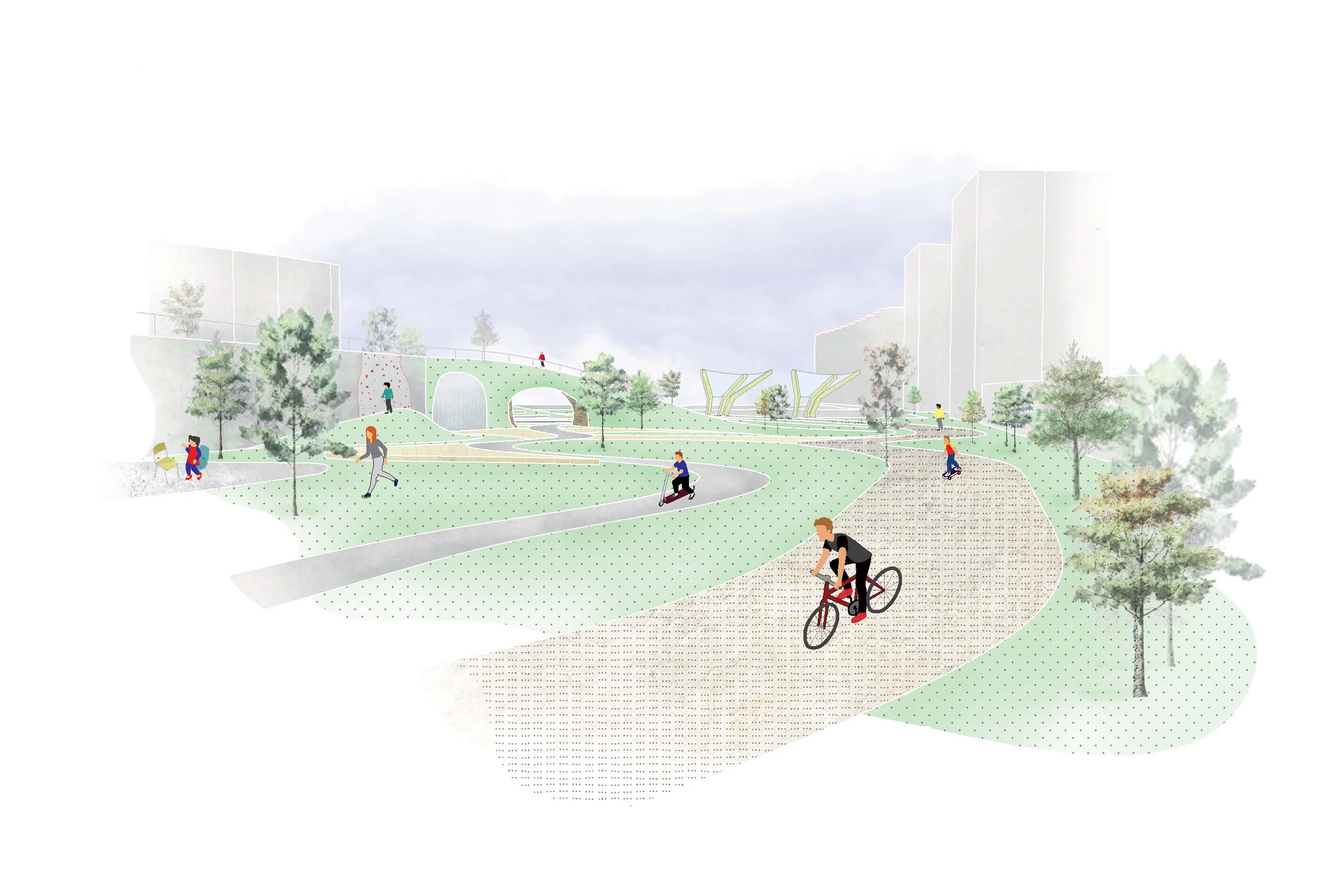 We proposed a mixed-use scheme with a range of building types — residential apartments, leisure spaces, infrastructure and landscape. Our ambition was to develop the site gradually, while regenerating and planting the surrounding landscape, allowing this relatively new part of the city to grow and develop organically into a liveable and lively place. The buildings we proposed were bold in vision and scale, with more delicate and intimate landscaping to provide a necessary counterpoint.