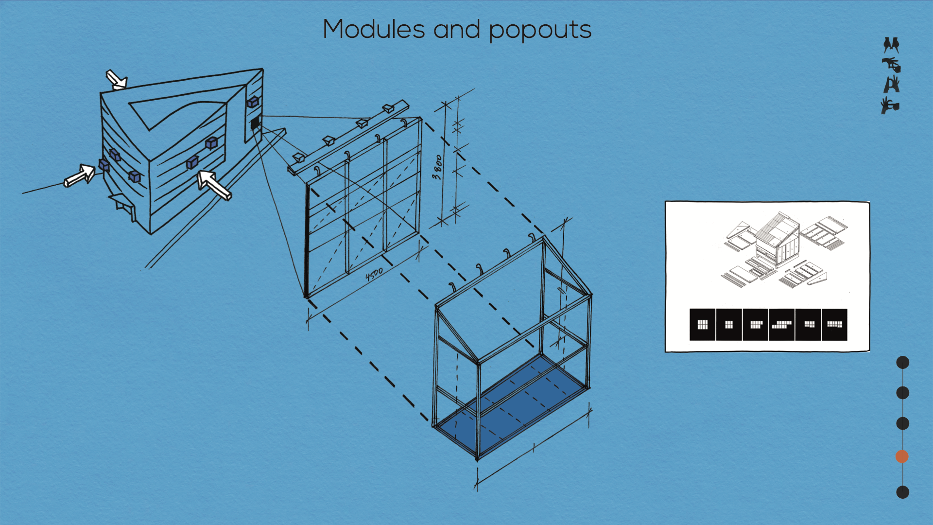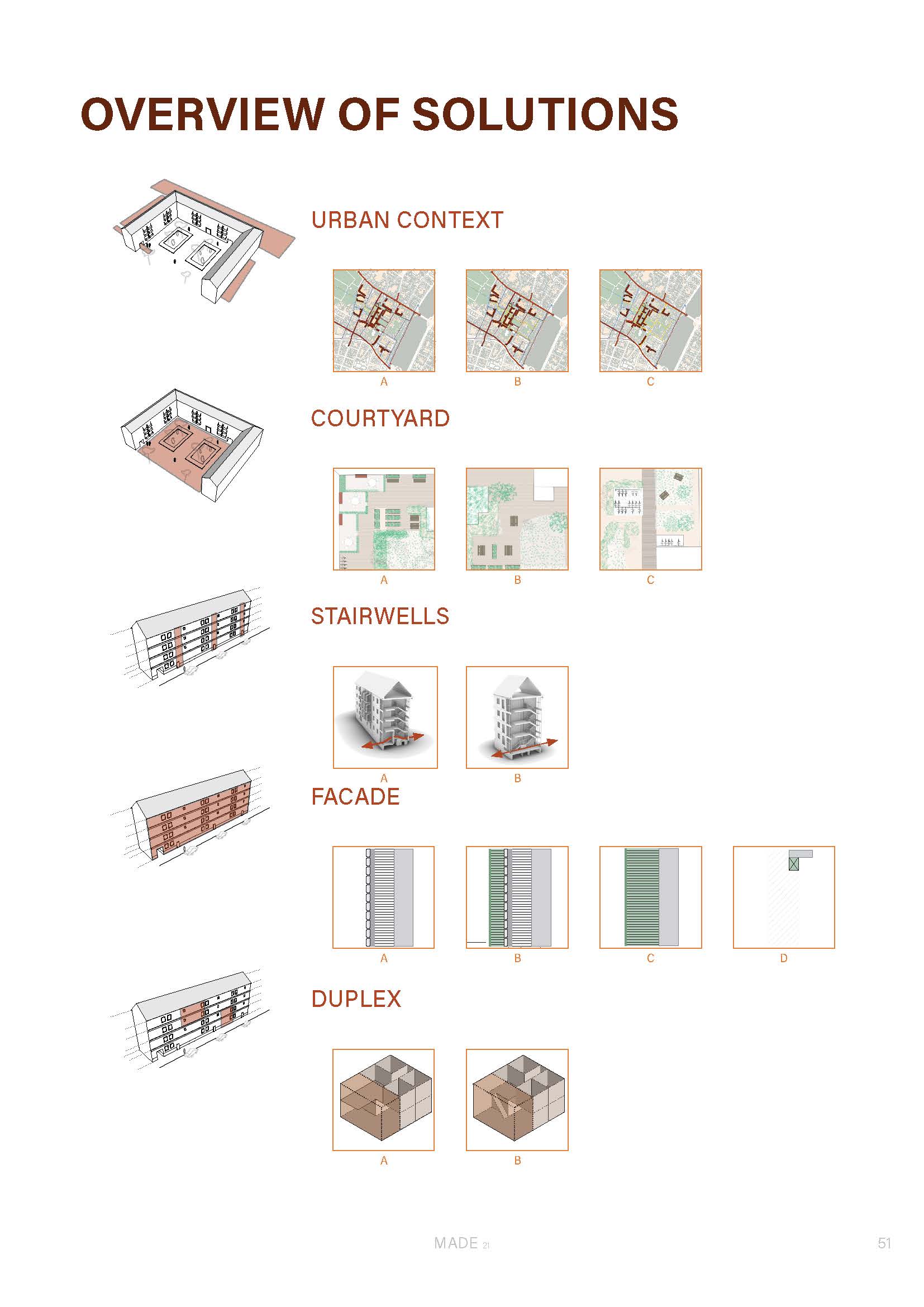 As part of our final presentation we developed a catalog of conceptual solutions for each identified problem area. Instead of tunnelling on one grand solution, we identified multiple possible solutions within the urban context, courtyards, stairwells, facades, and corner apartments.