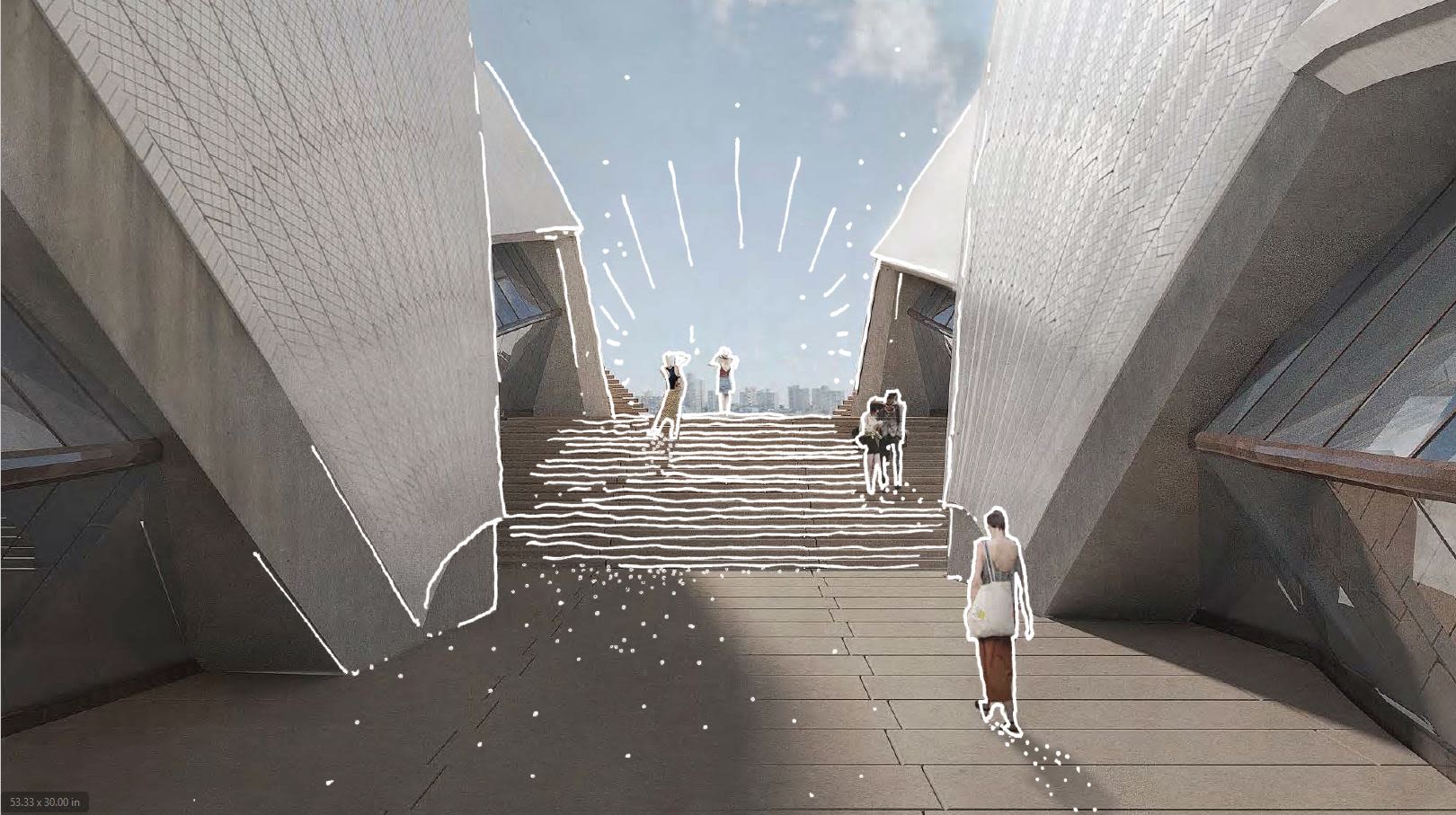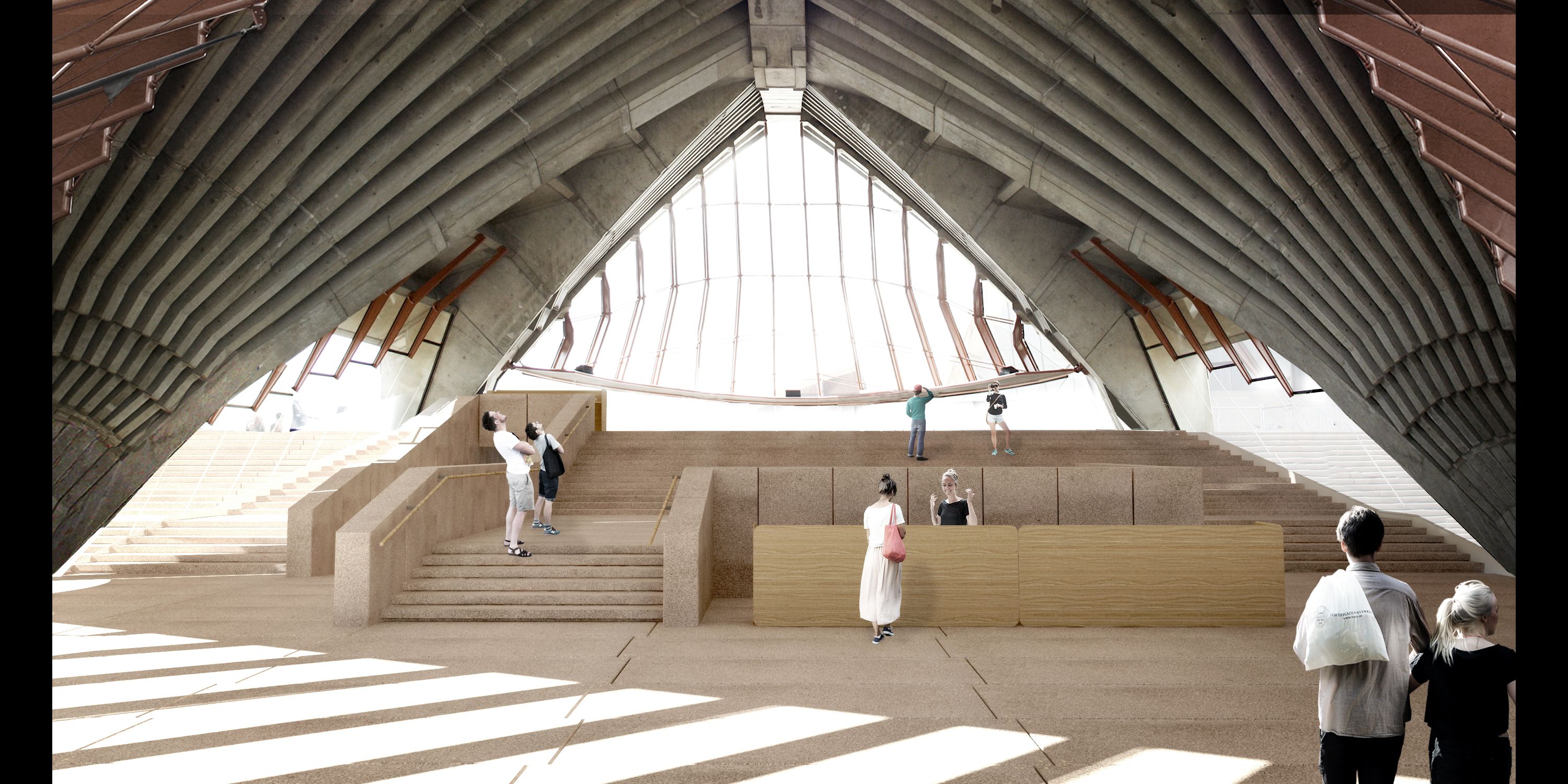 Consider the vertical ascent from the city to the Northern Foyers of the Sydney Opera House and how those foyers most naturally enhance and enrich the visitor’s experience of the Opera House. Students should consider that the urban, spatial and architectural qualities of the journey characterised by Utzon must continue evolving as Sydney changes and the Opera House undergoes renewal. Students should also consider the role of the foyers, their connection to the building, visitor experience and different modes of operation throughout the day and night.