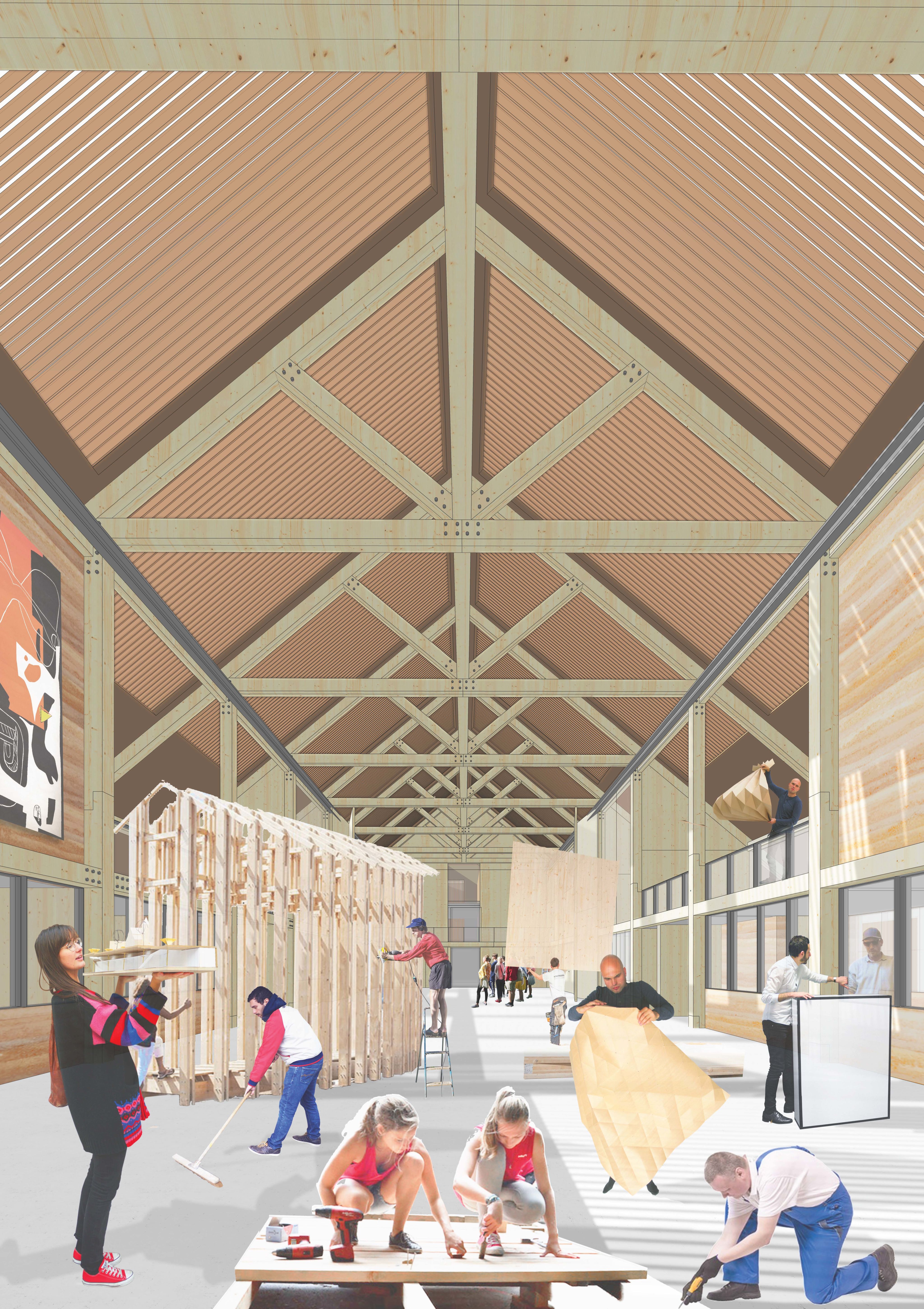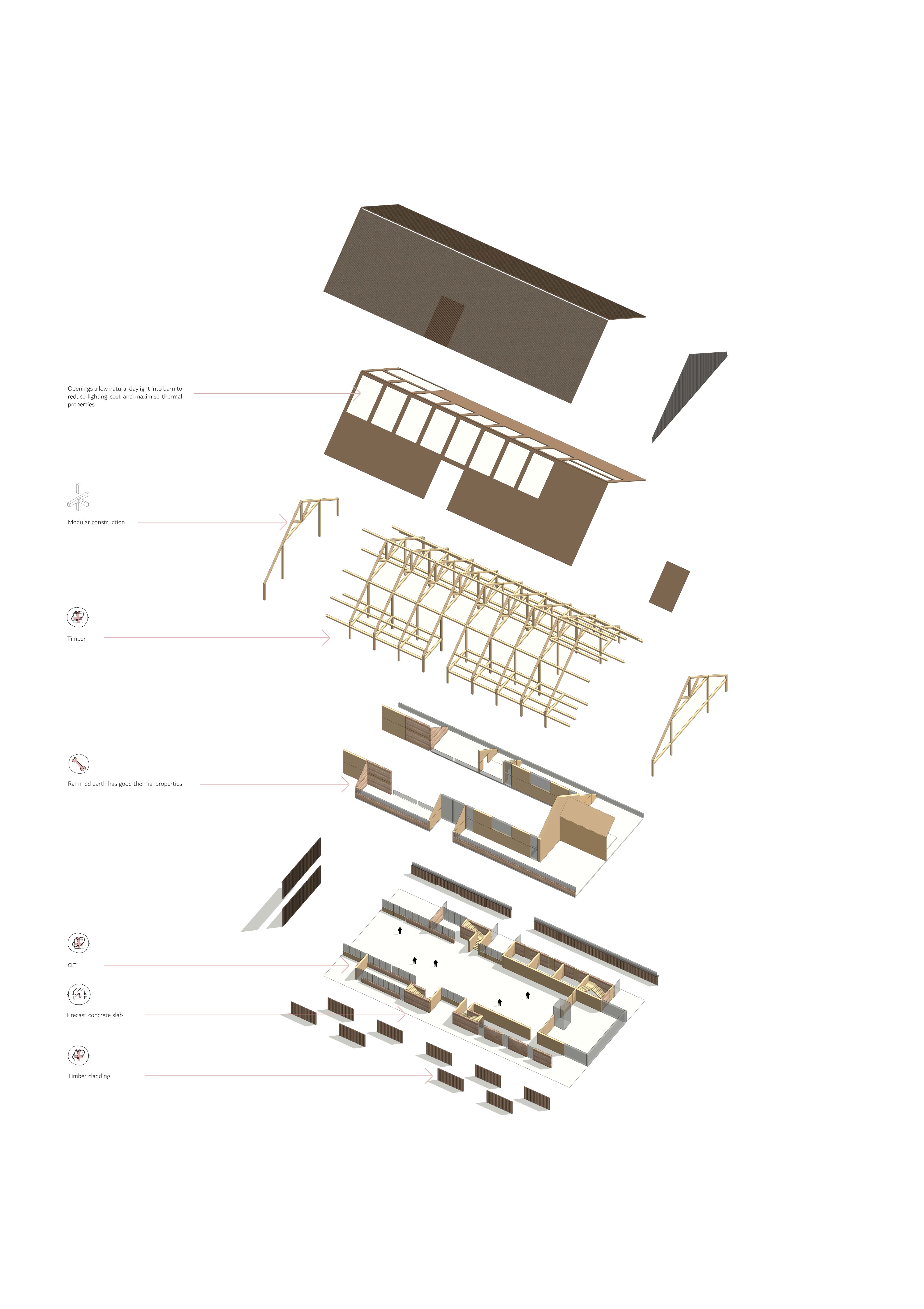 Students are asked to design a NEW BARN/a multifunctional space at Godsbanen next to the new Architecture School in Aarhus (NEW AARCH). The NEW BARN will be located at a railway goods area, Godsbanearealerne, in the heart of Aarhus, close to the railway station and the city centre – a new neighbourhood with a new identity called ‘AarhusK’–K for ’kreativitet, kunst og kultur’ (creativity, art and culture). The project must: meet the functional demands; relate to the physical and social context of the site and future users; take learnings from the historic evolution of barns and historic construction systems; consider the integration of structural, environmental, social, and architectural design parameters in one tectonic solution; and focus on sustainability and minimising the environmental impact.